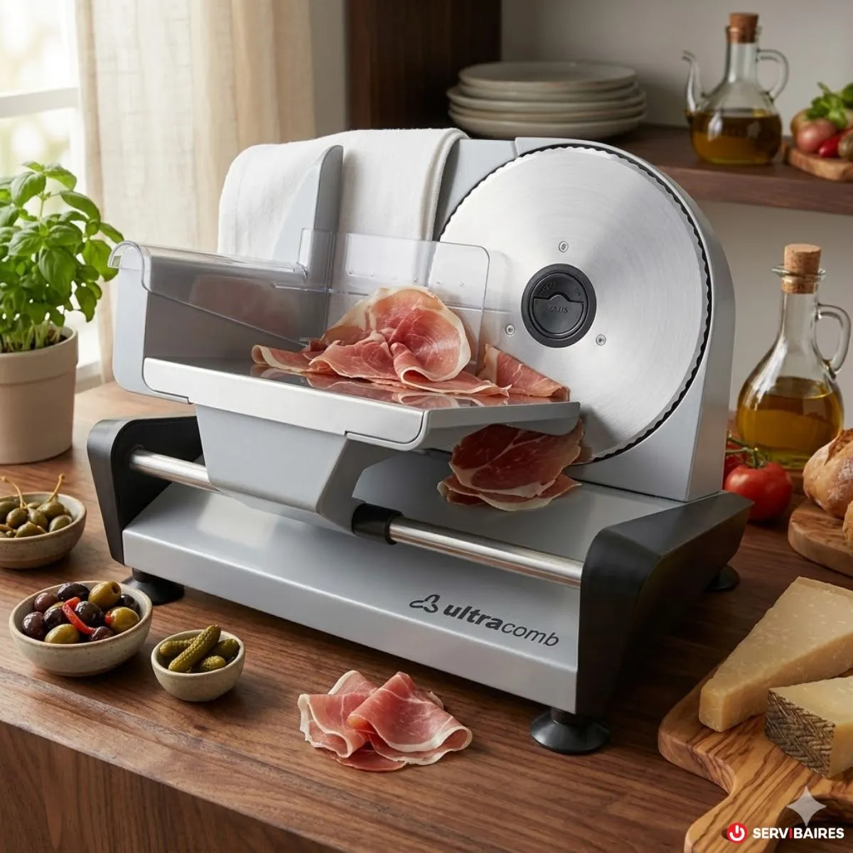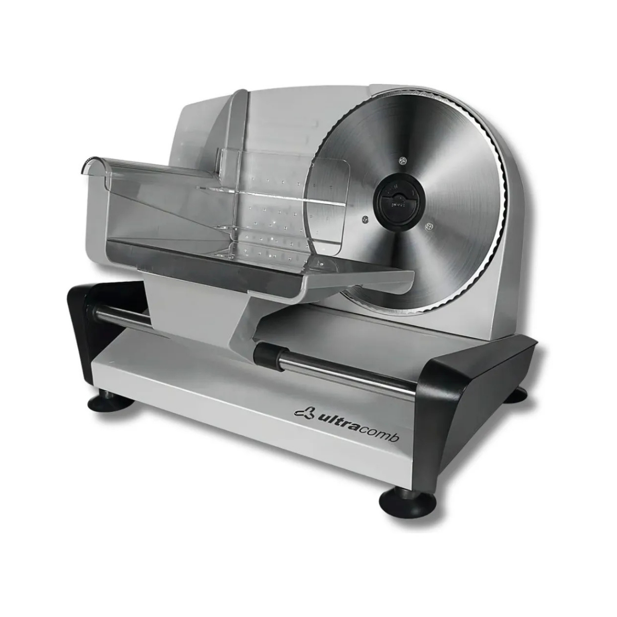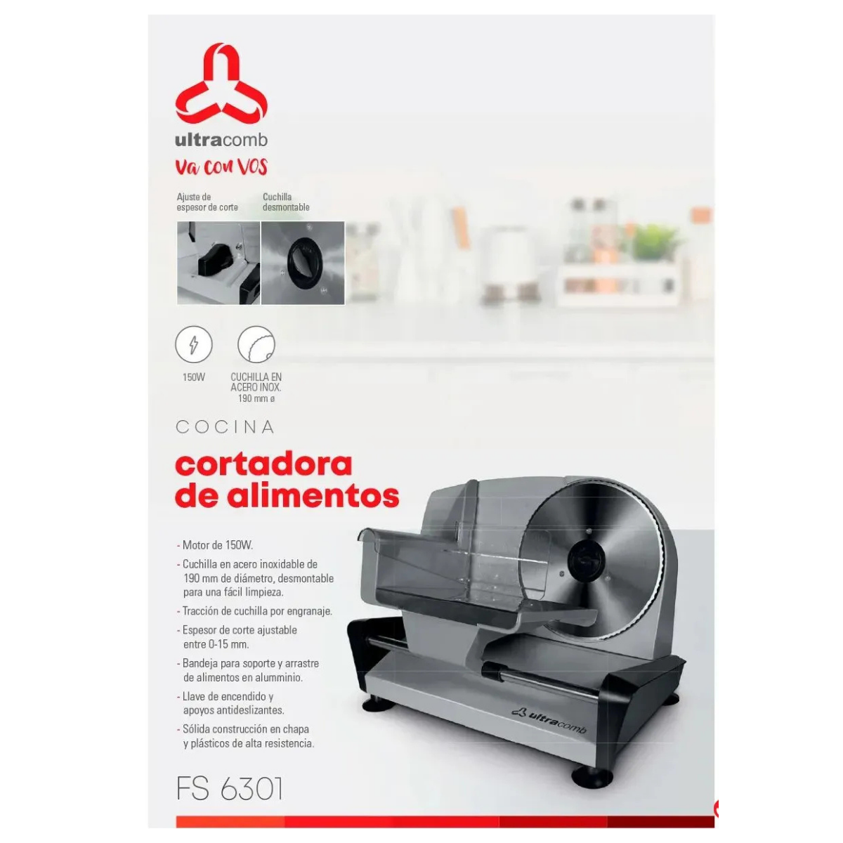 La Cortadora de Fiambres Familiar Ultracomb FS-6301 es la solución ideal para quienes buscan versatilidad y calidad en la preparación de alimentos. Con un potente motor de 150W, esta cortadora permite un rendimiento óptimo en el hogar. Su cuchilla de acero inoxidable de 190 mm de diámetro, desmontable para una limpieza sencilla, garantiza cortes precisos y duraderos. El grosor de corte es ajustable, permitiendo seleccionar entre 0 y 15 mm, adaptándose a tus necesidades culinarias. Además, cuenta con una bandeja de soporte y arrastre de alimentos en aluminio, asegurando un manejo cómodo y eficiente. La sólida construcción en chapa y plásticos de alta resistencia, junto con los apoyos antideslizantes y la llave de encendido, brindan seguridad y estabilidad durante su uso. Con la Ultracomb FS-6301, disfrutarás de la frescura y calidad en cada rebanada.